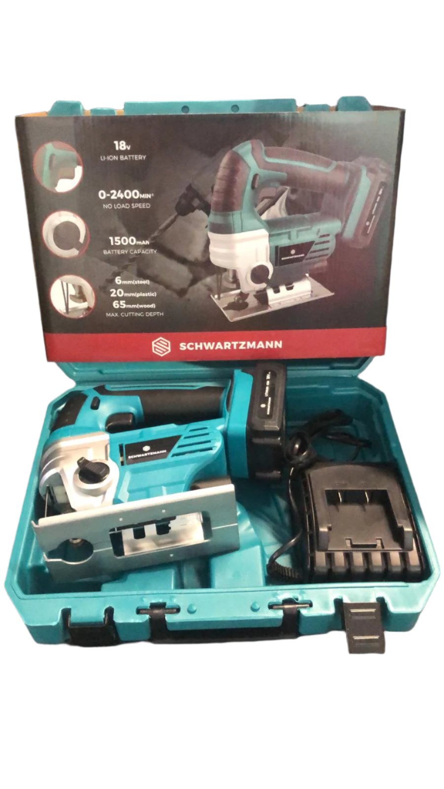 The SchwartzMann cordless jigsaw features a locking button and an on/off switch, providing easy and safe operation. The soft grip ensures comfortable use, while the pendulum switch with 4 positions allows for precise cutting. With a quick-release clamp and 18v Li-ion battery, it offers a no-load speed of 0-2400min and a 1500mah battery capacity. It can cut up to 6mm of steel, 20mm of plastic, and 65mm of wood, making it a versatile and efficient tool for all your cutting needs.